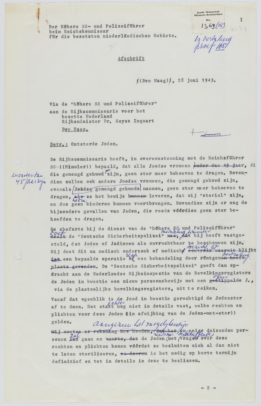 Rapport met handgeschreven correcties van de 'Höhere SS- und Polizeiführer aan Seyss Inquart over rechten en plichten van ontsterde joden, juni 1943