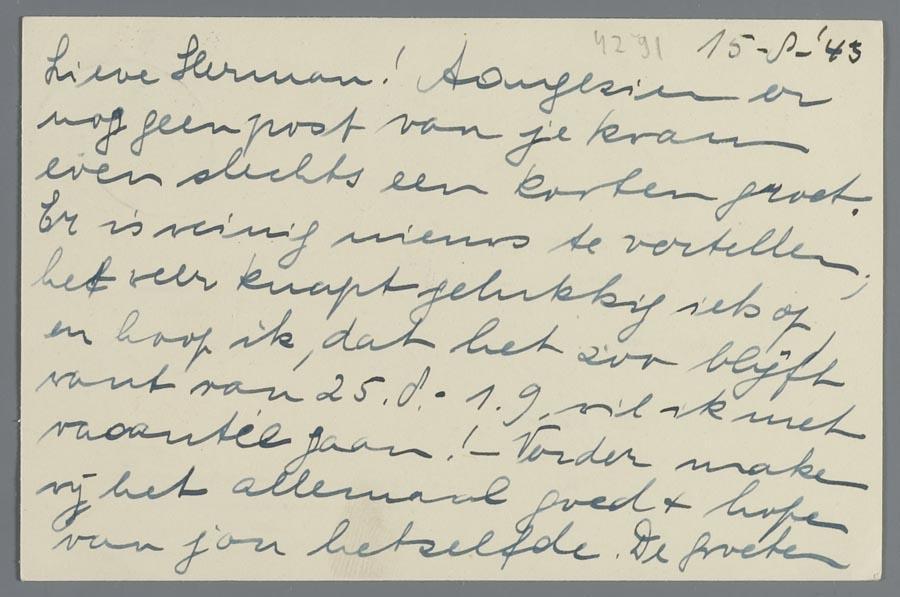 Briefkaart van Louis Ph. Polak, aan Herman Boasson in Westerbork, 1943