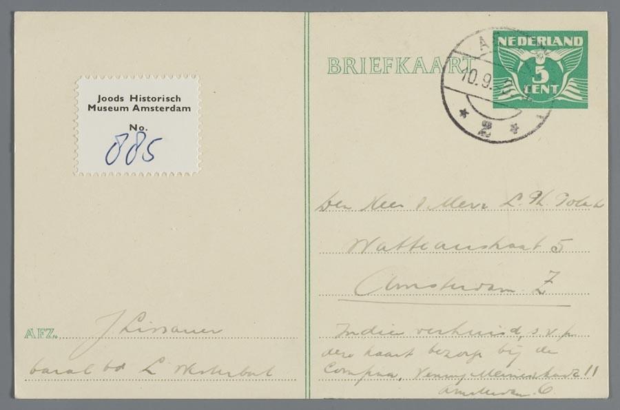 Briefkaart van Jack Lissauer uit Westerbork aan Louis Ph. en Alice Polak, september 1943