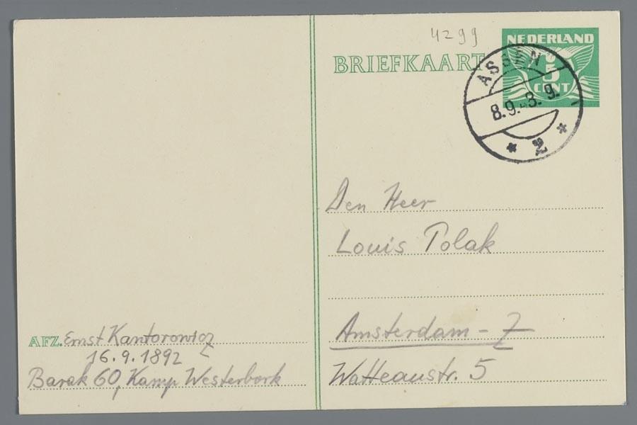 Briefkaart van Ernst Kantorowitz in Westerbork aan L.Ph. Polak in Amsterdam, om hem te bedanken voor het gestuurde voedselpakket, september 1943