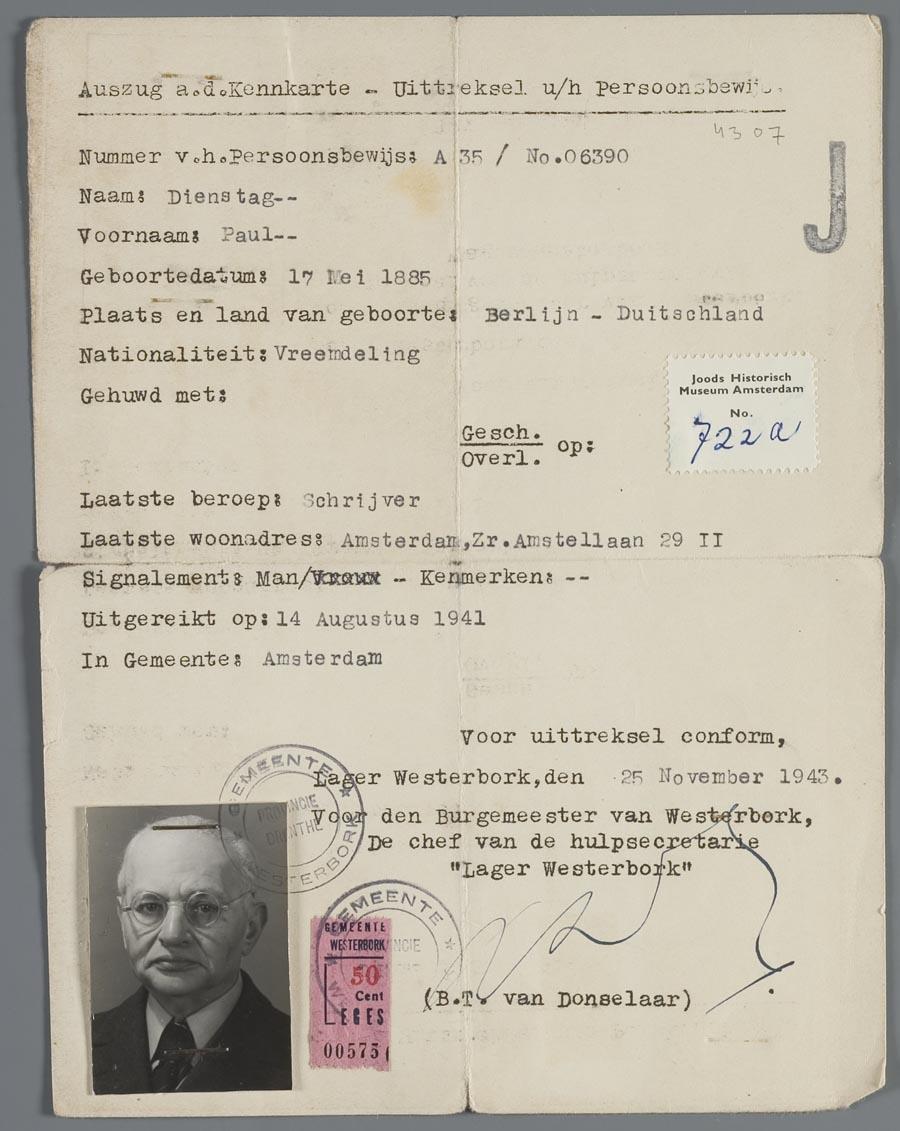 Uittreksel uit het persoonsbewijs van Paul Dienstag, uitgegeven door de gemeente Westerbork, november 1943