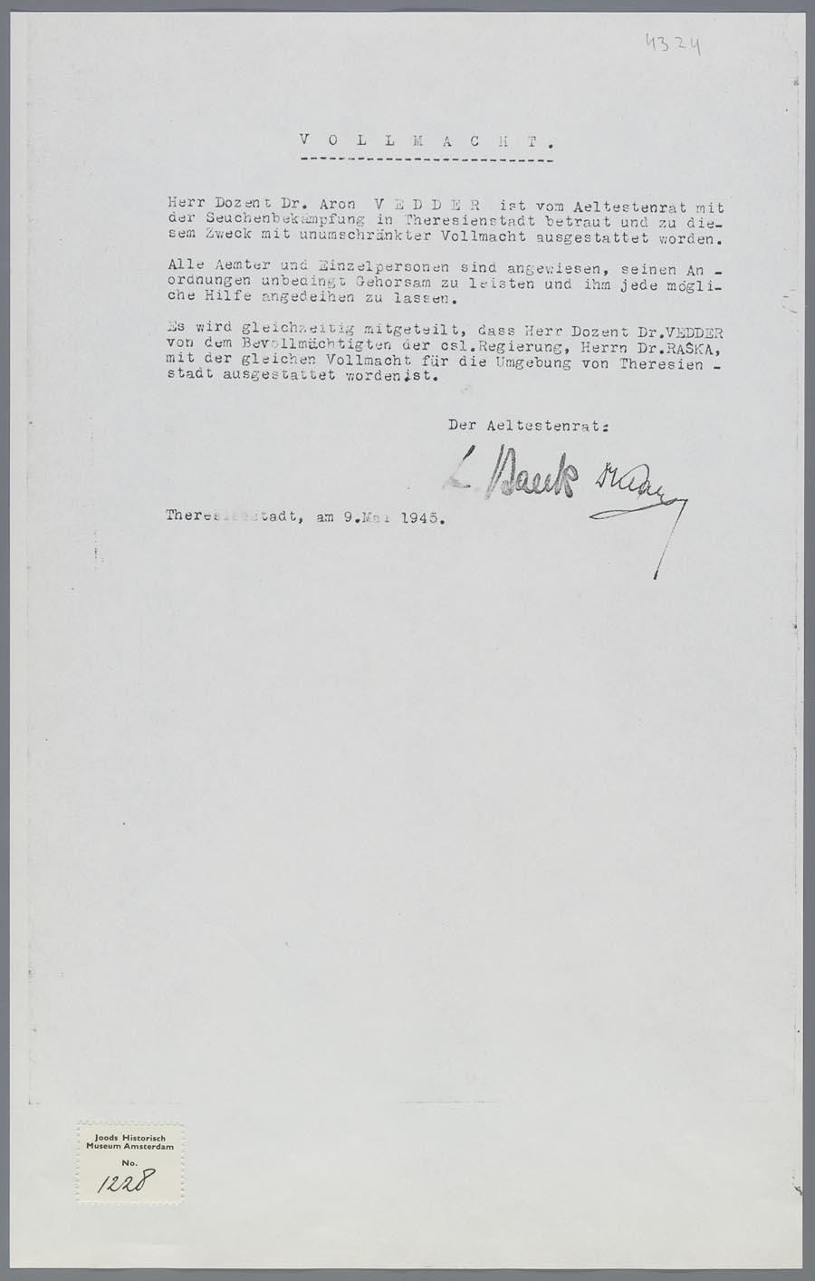 Volmacht (Duitstalig) betreffende de werkzaamheden van dr. Aron Vedder in Theresienstadt, mei 1945