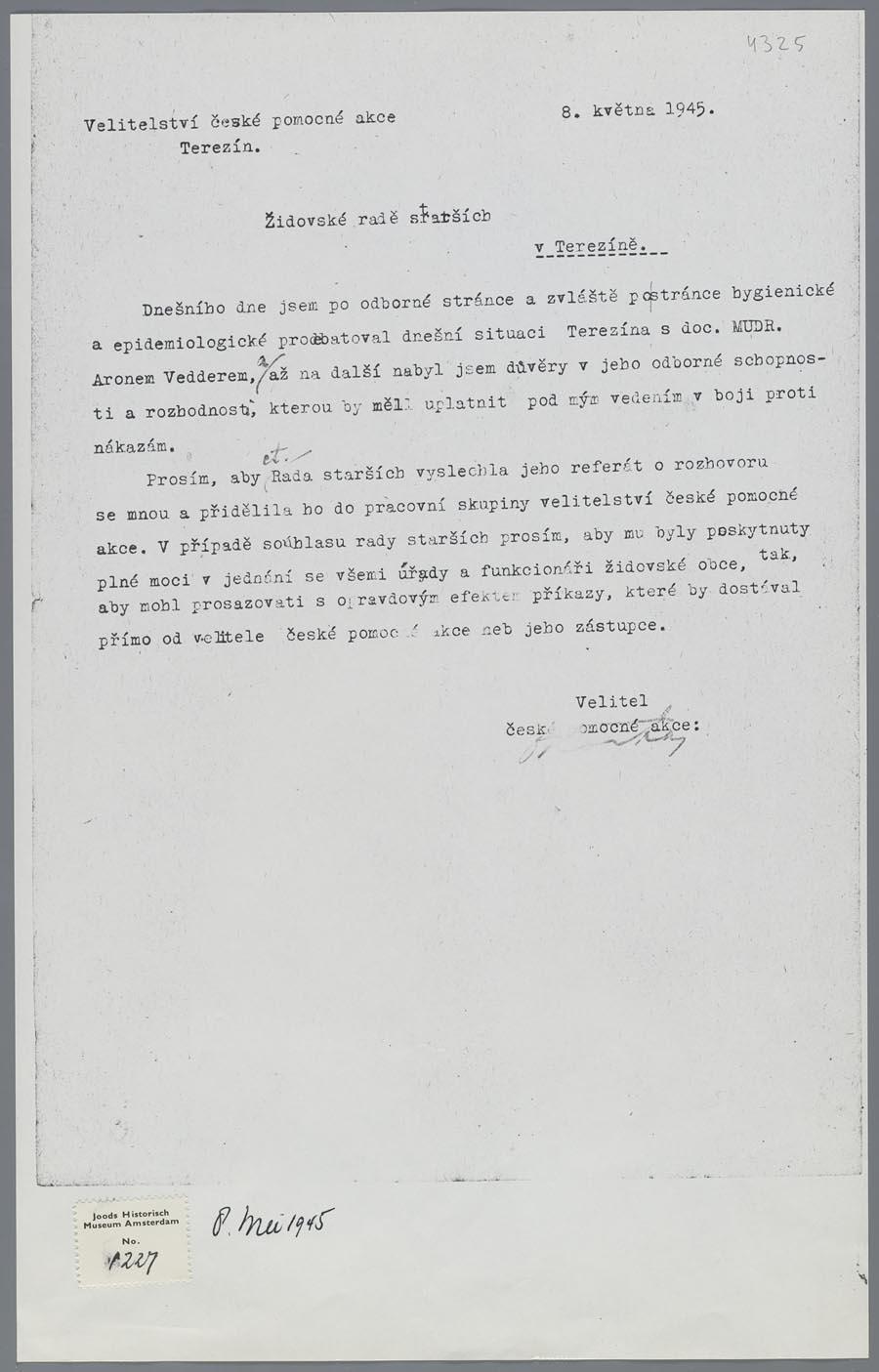 Verklaring (in het Pools) betreffende de medische werkzaamheden tijdens epidemieën in Theresienstadt, van dr. Aron Vedder, voorjaar 1945