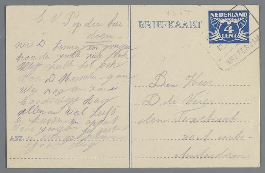 Briefkaarten (3) uit Westerbork van Alida Abas-de Vries; Rebecca Posener-Gokkes en familieleden en aan hun (half)broer, zwager en oom D. de Vries in Amsterdam, 1943