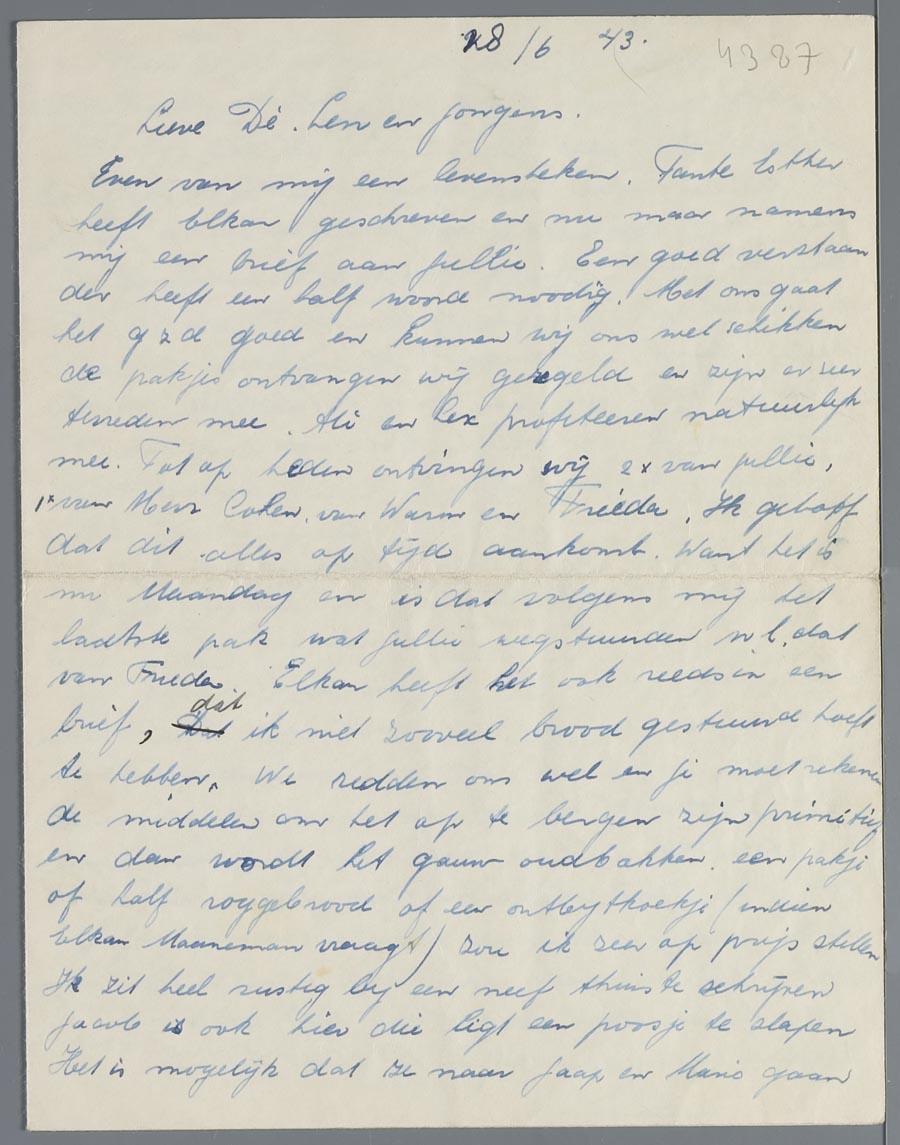 Brief uit Westerbork van Esther Goudsmit-de Vries aan haar broer David de Vries en familie in Amsterdam, 1943