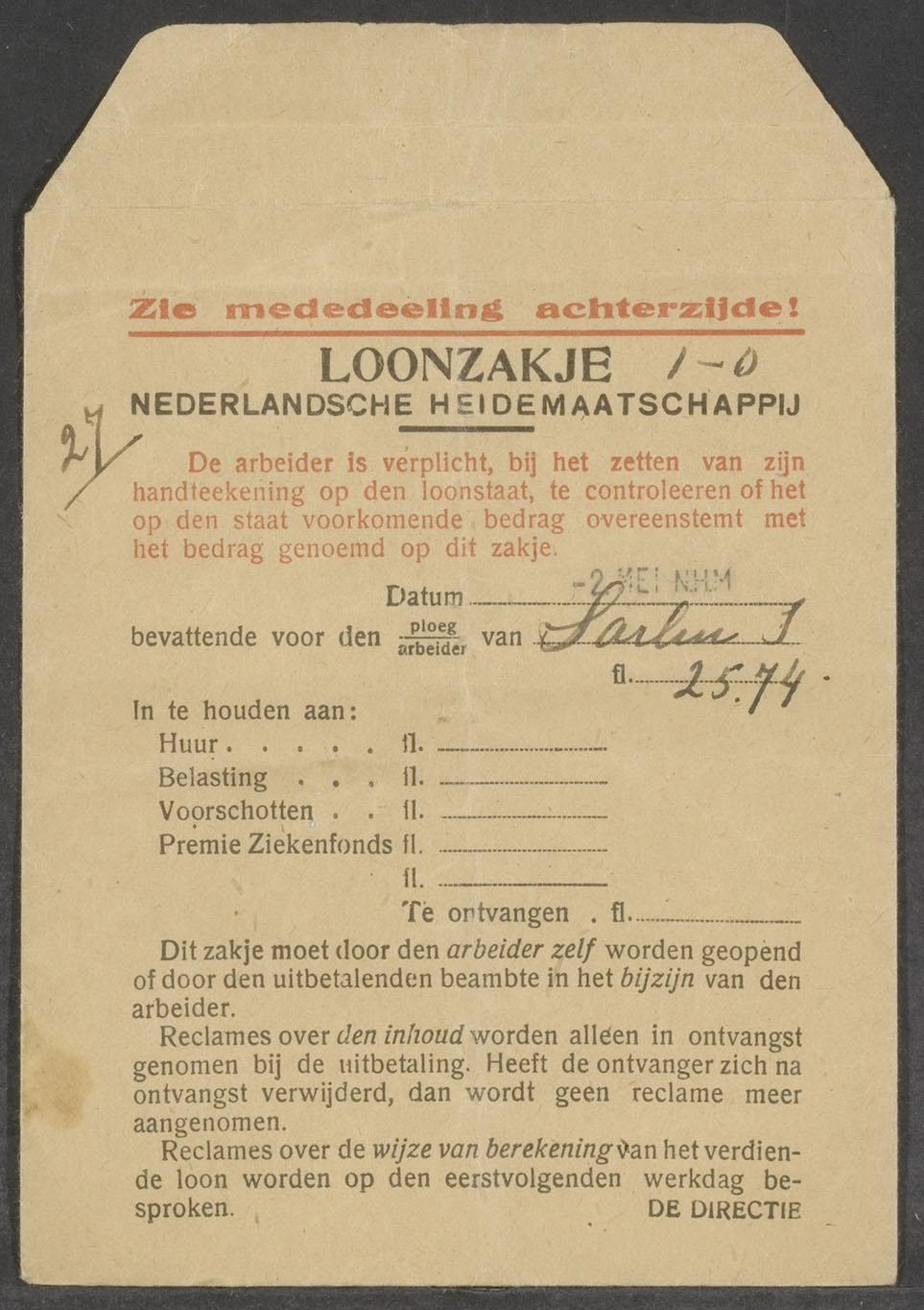 Loonzakjes (46) Ned. Heidemaatschappij, ontvangen door te werk gestelde I. Sarlui, circa 1942
