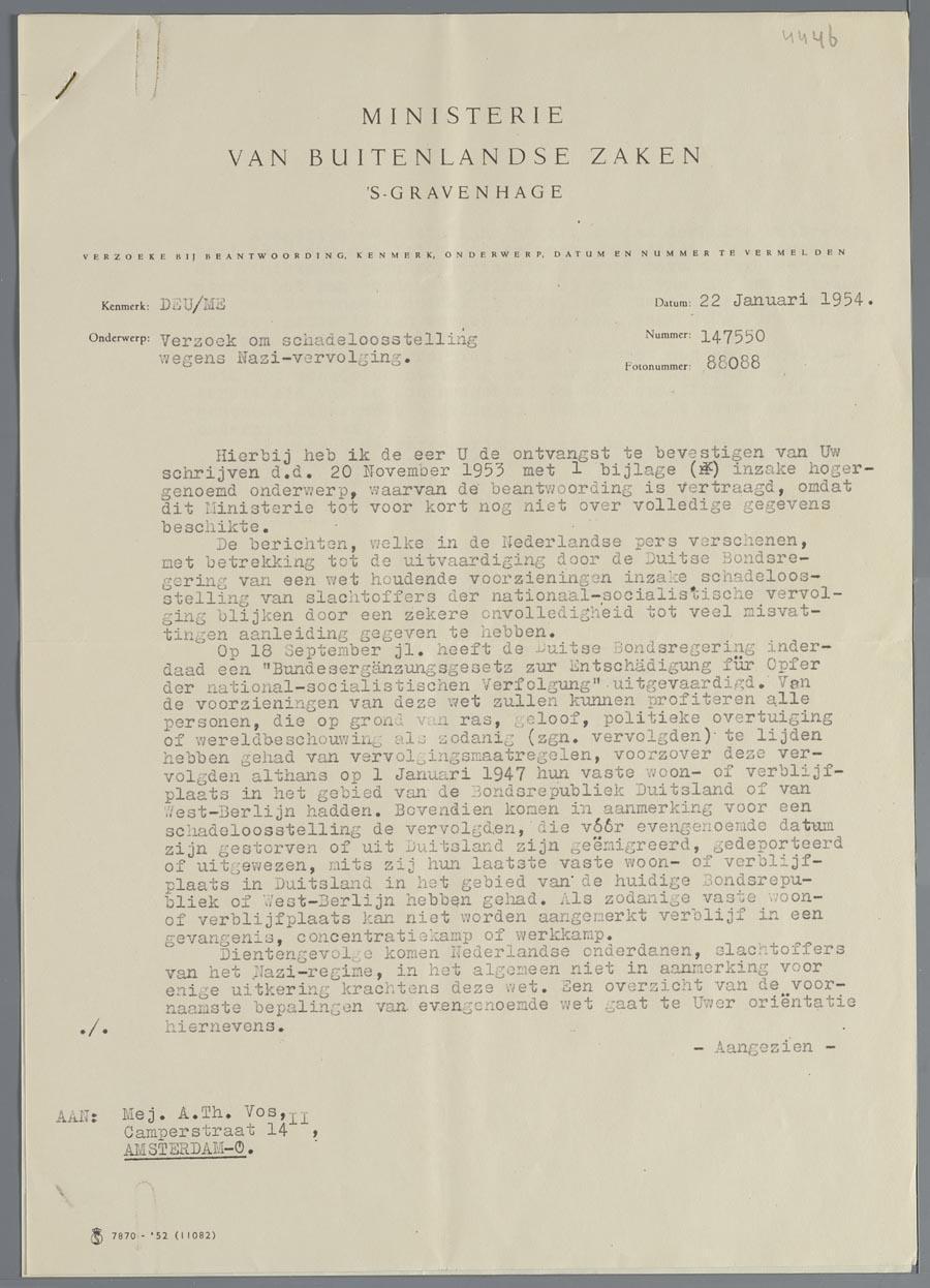 Brief van het Ministerie van Buitenlandse Zaken aan Alida Vos m.b.t. aanvraag schadeloosstelling nazivervolging, 1954
