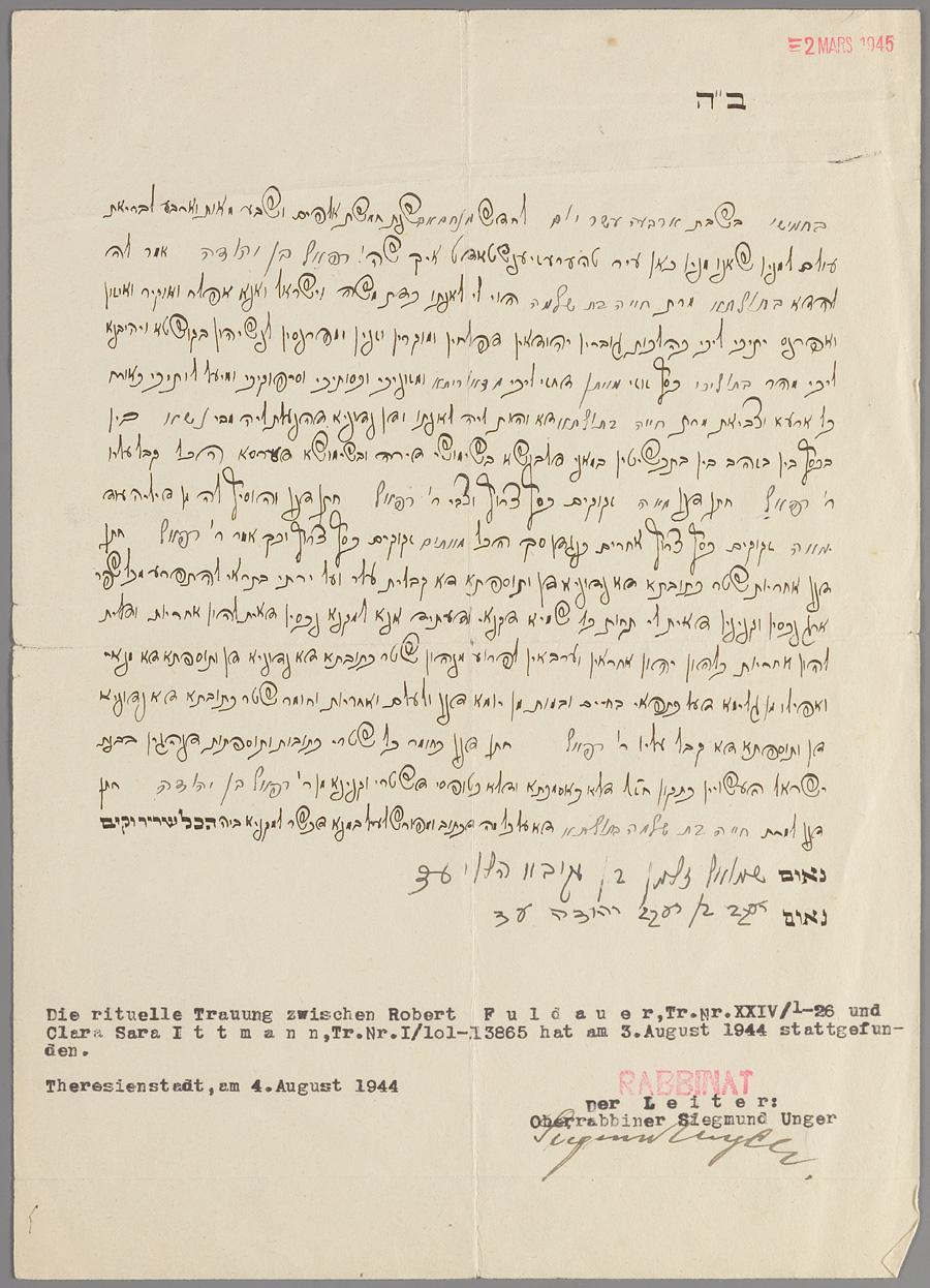 Huwelijksakte van het huwelijk tussen Robert Fuldauer en Clara Sara Ittmann, opgemaakt door het rabbinaat in Theresienstadt, augustus 1944