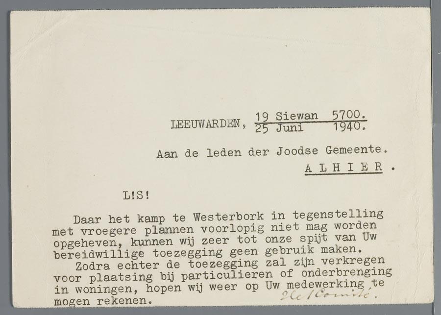 Mededeling van de joodse gemeente Leeuwarden dat Kamp Westerbork voorlopig niet mag worden opgeheven, juni 1940