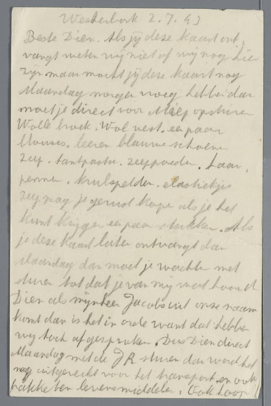 Briefkaart van Elie Koopman aan 'Dien', uit Westerbork, juli 1943. Geadresseerd aan Isaac Swaab, zwager van Elie.