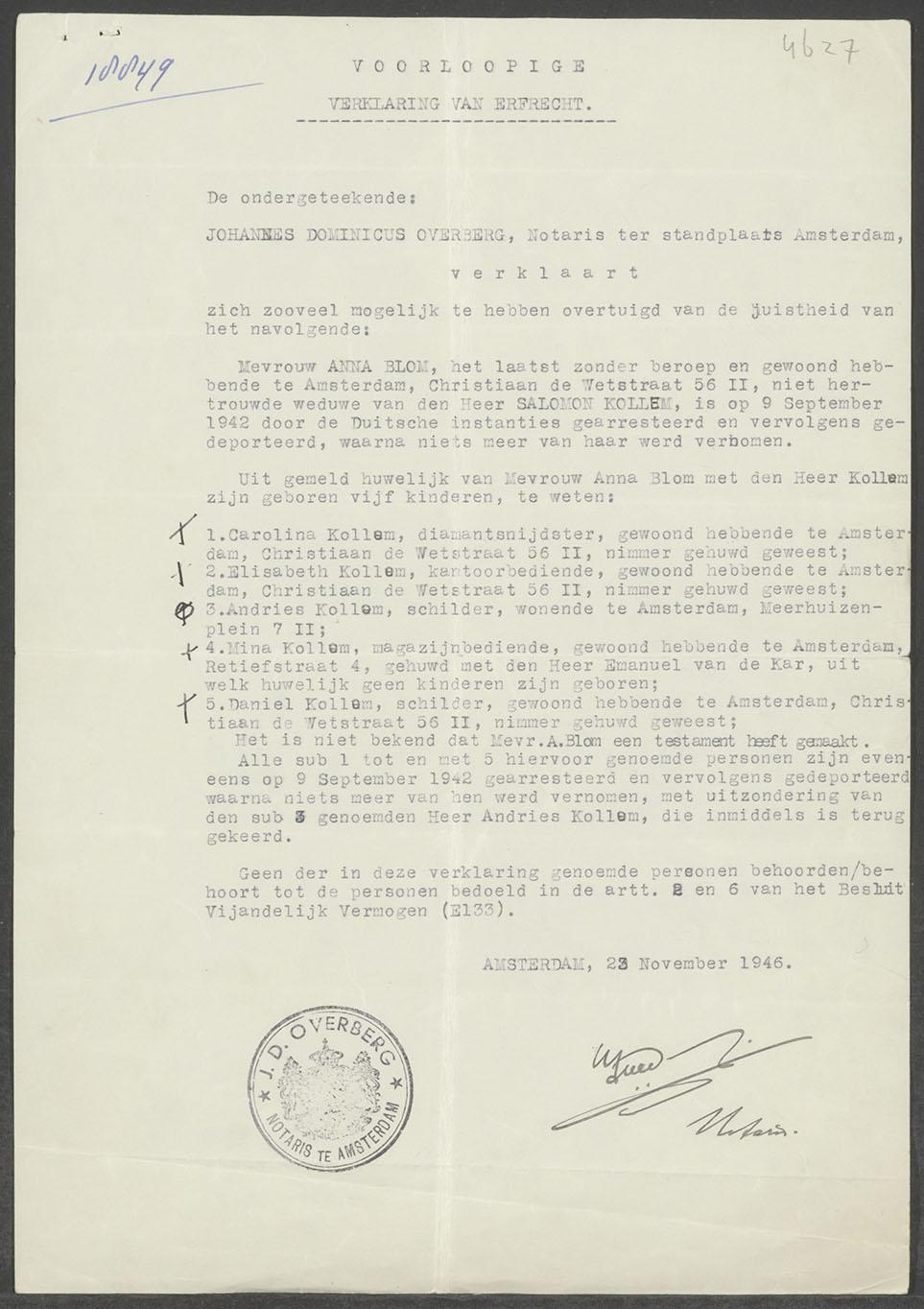 Verklaring van erfrecht m.b.t. Anna Blom, weduwe van Salomon Kollem en haar (omgebrachte) kinderen, 1946