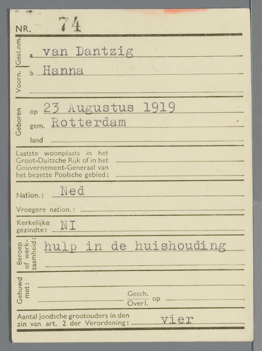 Aanmeldingsbewijs voor personen van geheel of gedeeltelijk joodschen bloede t.n.v. Hanna van Dantzig, 1941