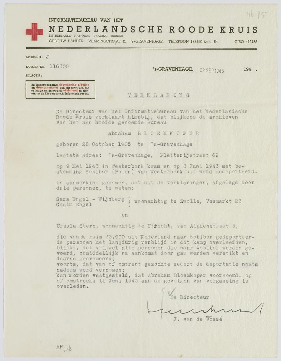 Verklaring m.b.t. het overlijden van Abraham Bloemkoper (1905-1943) te Sobibor, 1948