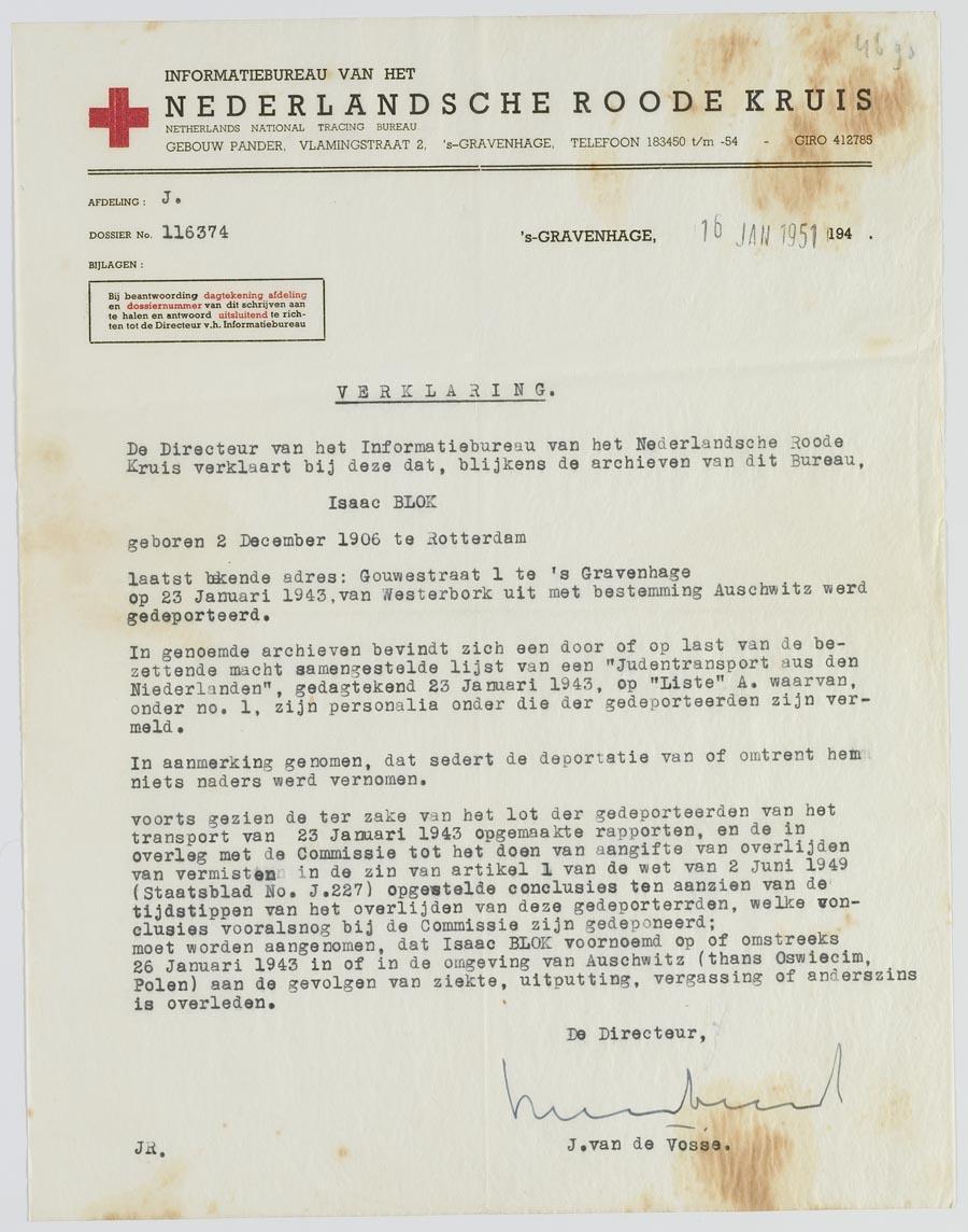 Verklaring m.b.t. het overlijden van Isaac Blok te Auschwitz (1943), 1951