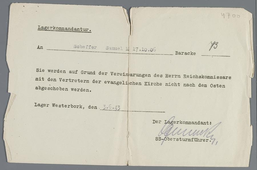 Mededeling van kamp Westerbork dat Samuel Scheffer niet naar het Oosten gedeporteerd zal worden op grond van een overeenkomst met de Evangelische kerk, juni 1943