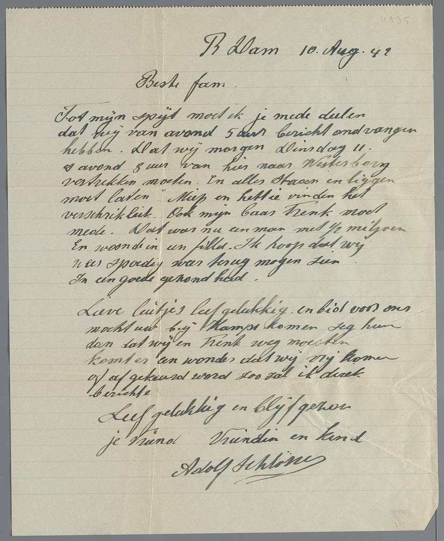 Brief van Adolf Schlösser over vertrek naar Westerbork, 1942