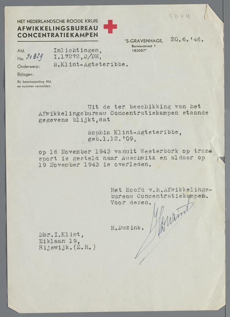 Verklaringen (3) van het Ned. Rode Kruis gericht aan I. Klint, m.b.t. overlijden van Sophia Klint-Agsteribbe en informatie betreffend Froukje Vogelina Klint, 1946-1948