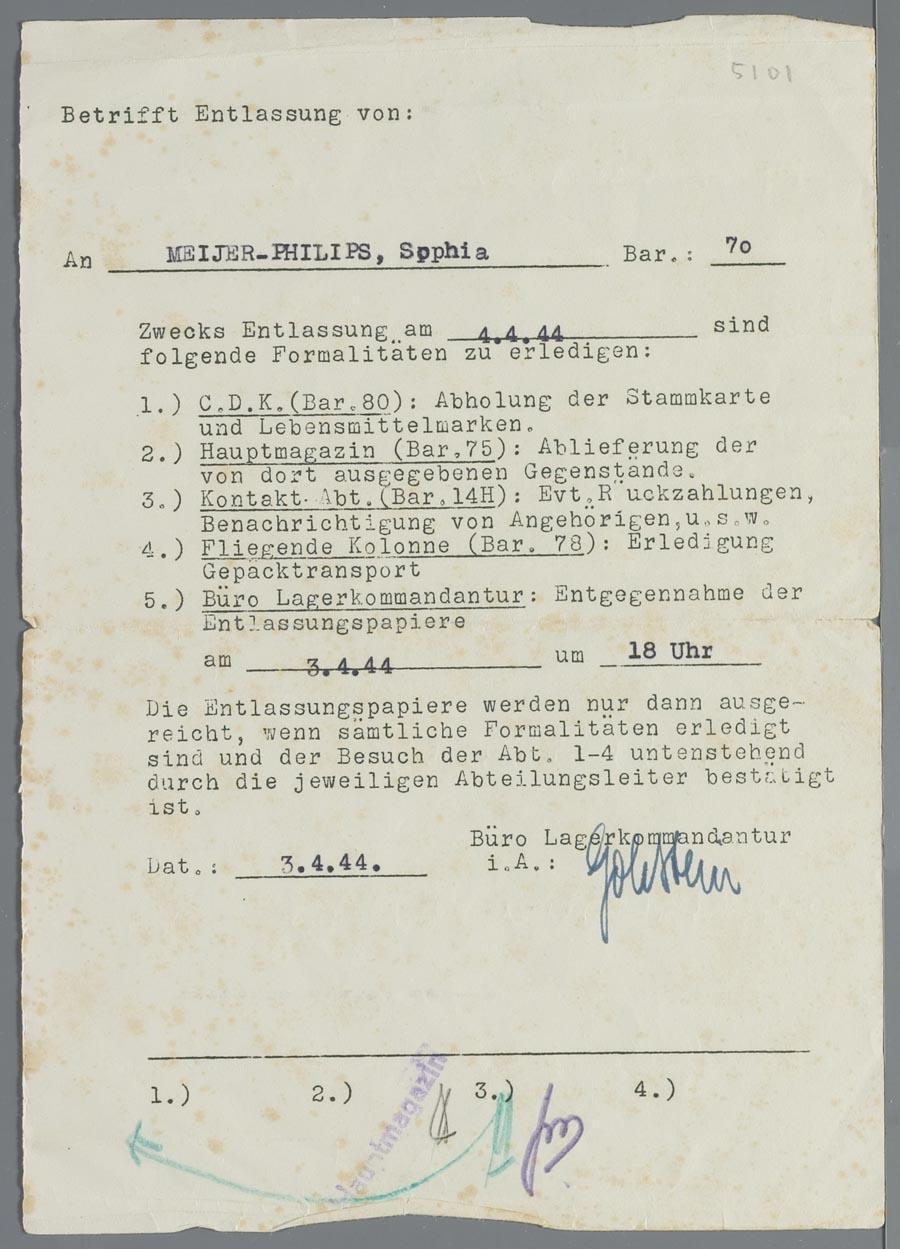 Formulier met de doorlopen procedures voor de vrijlating van Sophia Meijer-Philips uit Westerbork op 4 april 1944