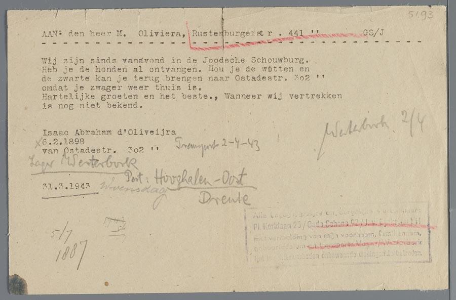 Telegram van Isaac d'Oliveyra uit de Hollandsche Schouwburg aan zijn broer Maurits d'Oliveijra, 1943
