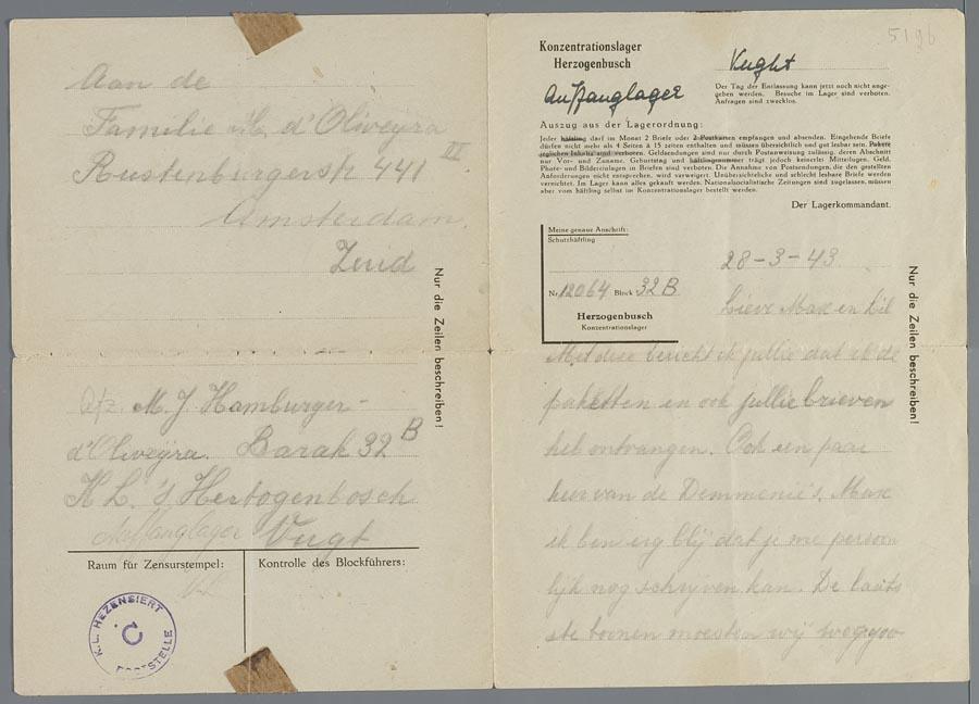 Brieven (2) van M.J. Hamburger-d'Oliveyra uit Vught aan Max en Lilly d'Oliveijra, 1943