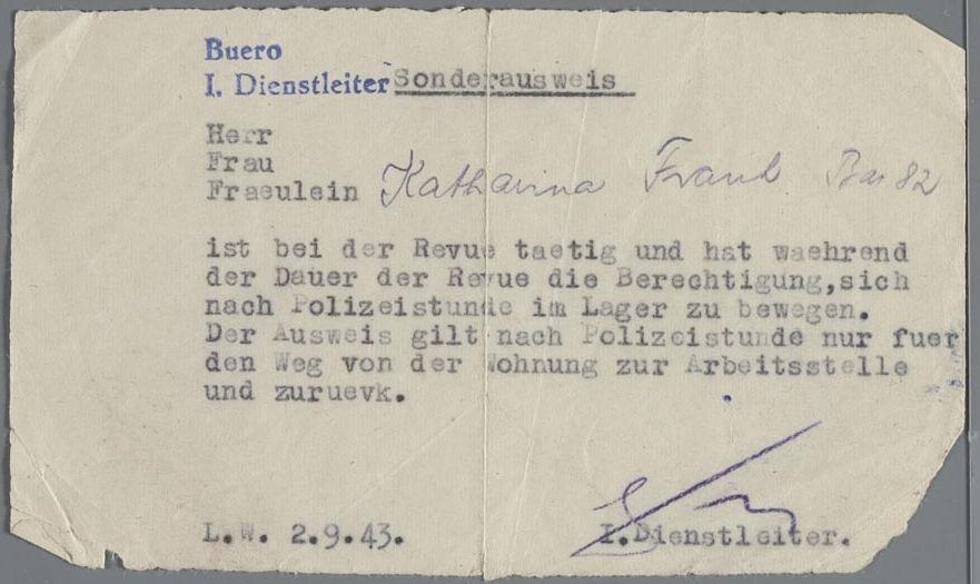 Verklaring dat Catharina Frank-Brucker meewerkt aan de revue in kamp Westerbork, en zich derhalve buiten spertijden in bepaalde gebieden van kamp Westerbork mocht begeven, september 1943