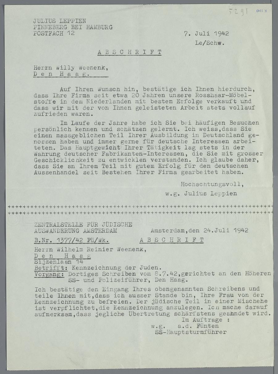Brief aan Willy Weenenk met de mededeling dat zijn joodse vrouw geen ontheffing krijgt voor het dragen van de jodenster, juli 1942