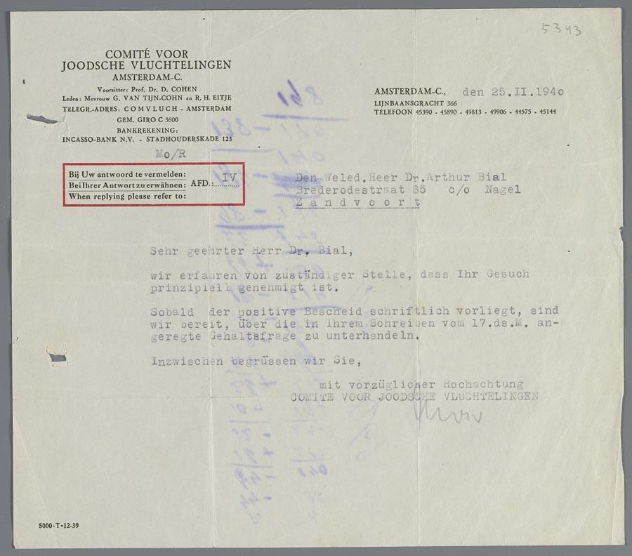 Brief van het Comité voor Bijzonder Joodse belangen met de mededeling dat Arthur Bial dat zijn verzoek ingewilligd zal worden, februari 1940