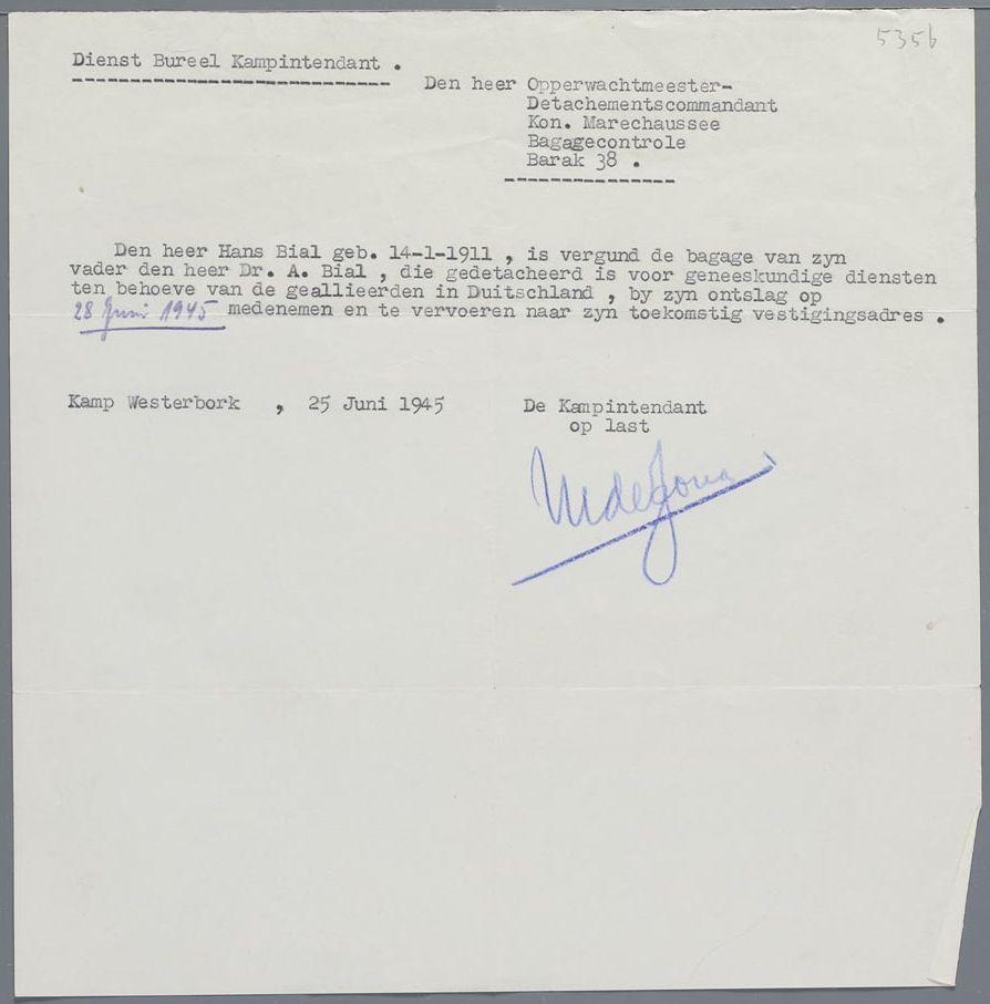 Verklaring dat Hans Bial de bagage van zijn vader A. Bial uit kamp Westerbork mag meenemen, juni 1945