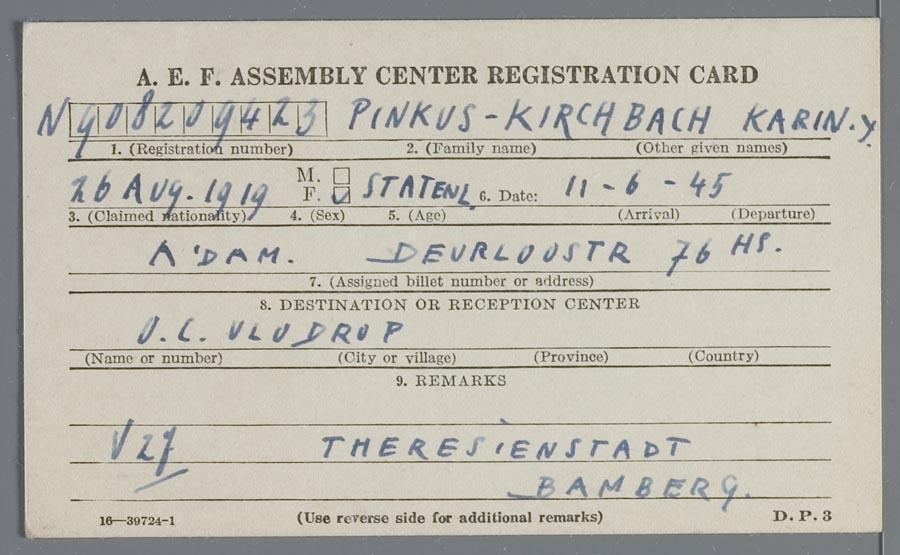 Aanmeldingskaarten voor gerepatrieerden (2x), A.E.F. Assembly Center Registration Card en A.E.F. Ass. center Index cards op naam van Karin en Joachim Pinkus, 1945
