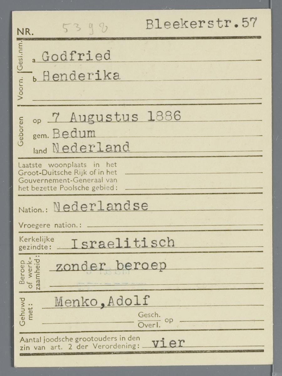 Bewijs van aanmelding (3) voor personen van joodsen bloede t.n.v Adolf Menko, zijn echtgenote Henderika Menko-Godfried en hun zoon Siegfried Alfred Menko, 1941