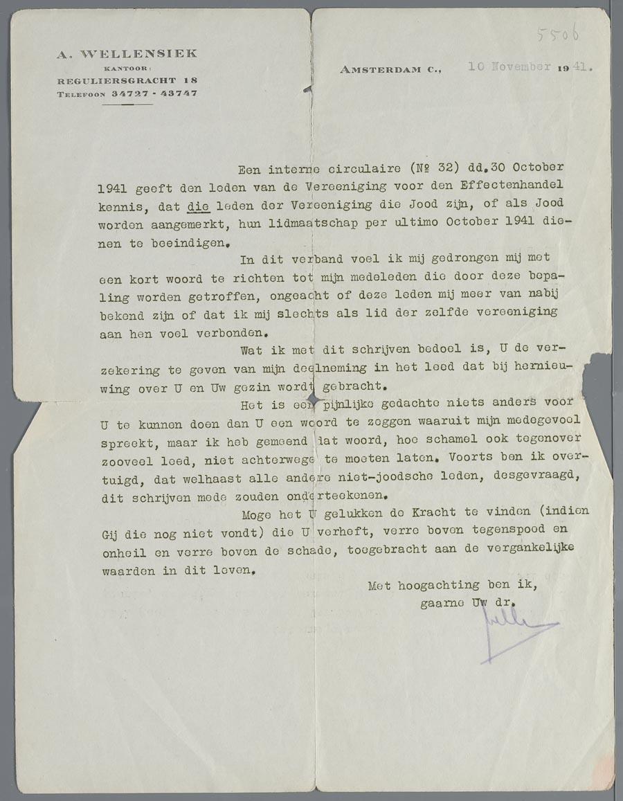 Brief aan joodse leden van de Vereniging voor de Effectenhandel, over de gedwongen beëindiging van hun lidmaatschap, met steunbetuiging i.v.m. anti-joodse maatregelen, 1941