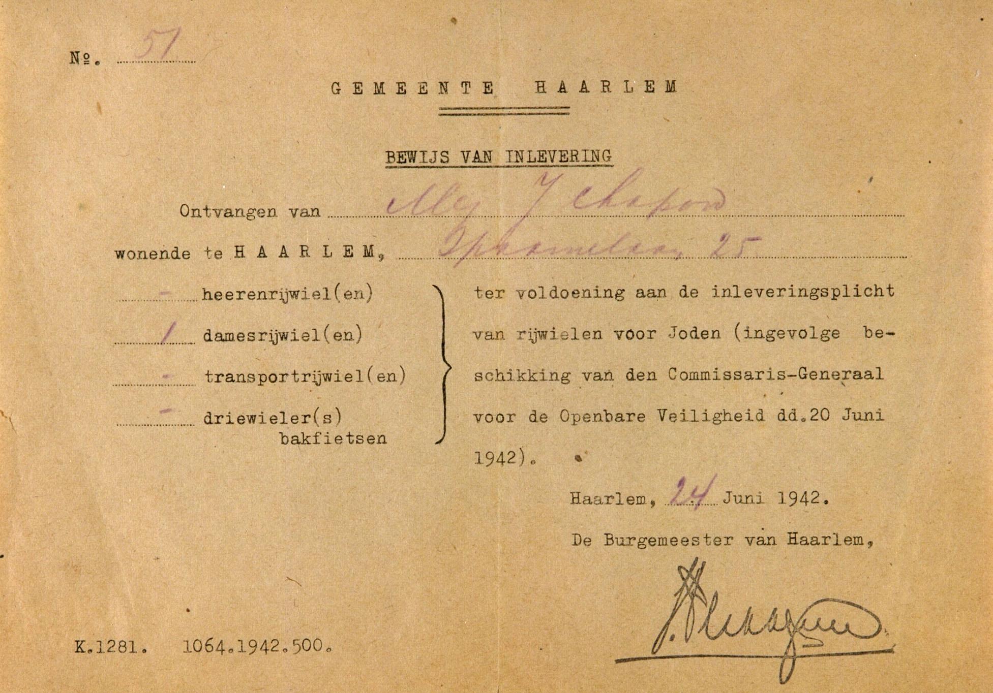 Inleveringsbewijs van een damesrijwiel op naam van Jenny Chapon, d.d. 24 juni 1942