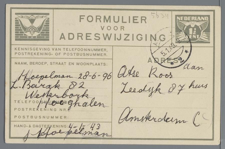 Adreswijzigingen (2) van Samuel Hoepelman in Westerbork, gestuurd aan Atse Roos in Amsterdam, december 1943