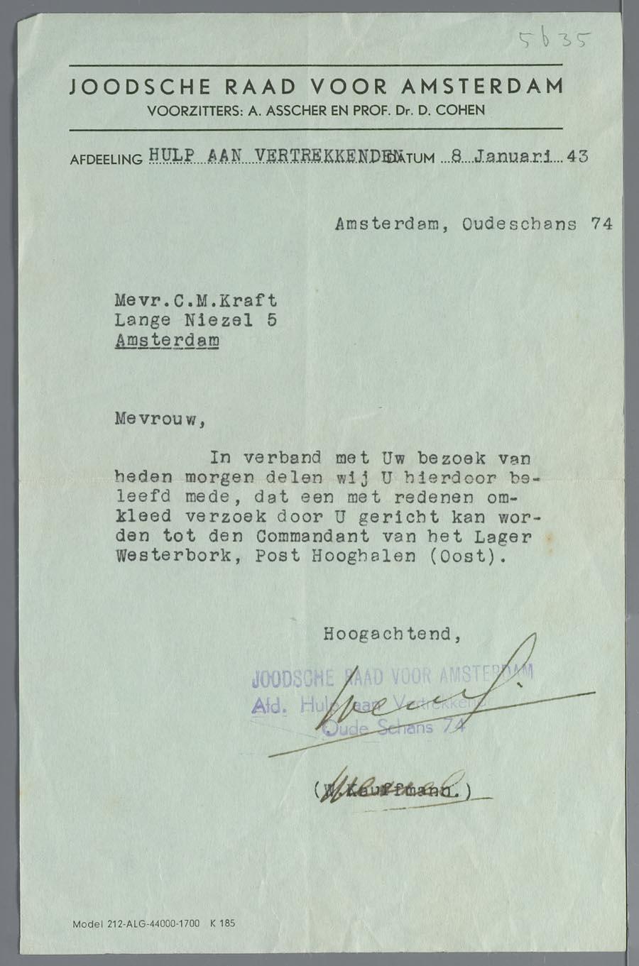 Brief van de Joodse Raad aan mevrouw C.M. Kraft met de mededeling dat zij een bepaald verzoek kan richten aan de commandant van kamp Westerbork, januari 1943