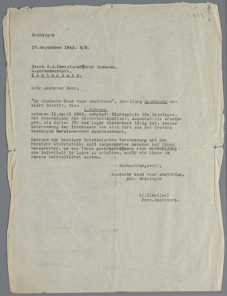Brief van Jacob Herman Meijer van de Joodse Raad aan kampkommandant Gemmeker van Westerbork, dat L. Bohemen als koerier voor kamp Westerbork werkzaam is, Groningen, september 1943