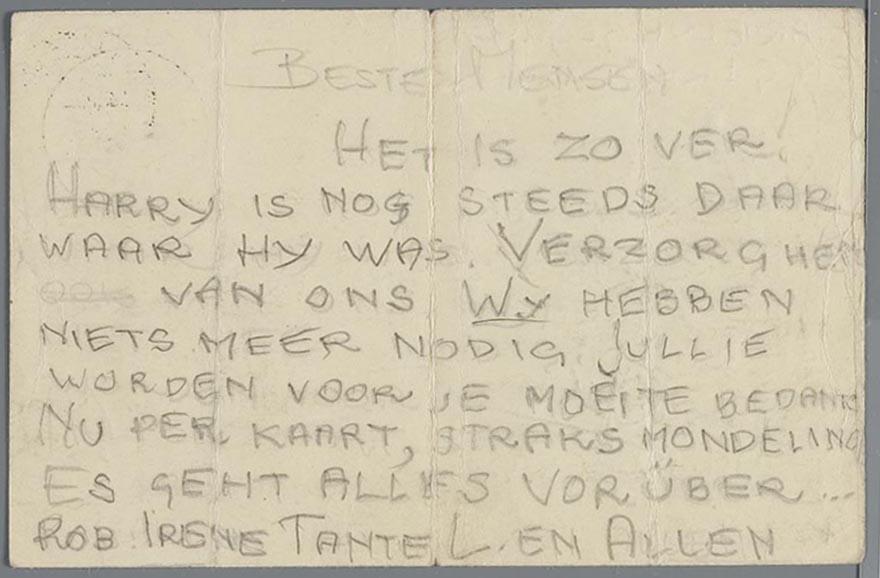 De kaart is gericht aan "beste mensen", speciaal "Rob, Irene, tante L. en allen", en ondertekend door Mau, (Saar?) en Api. Api was Abraham Spier; Mau en Saar waren zijn ouders Mozes en Sara. Salomon Kat was de schoonvader van één van de zussen van Sara Spier-Huisman.