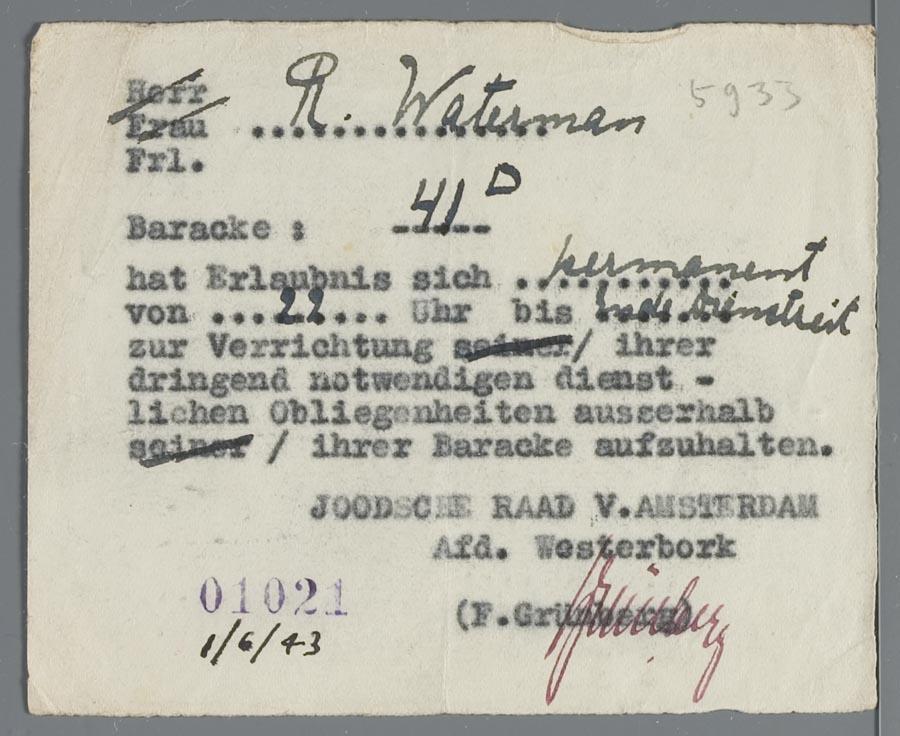 Arbeidskaarten (2), avondvergunning en identiteitskaart op naam van Rachel Waterman in Westerbork, 1942-1943