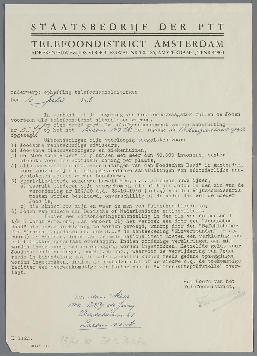 Mededeling van de PTT betreffende opheffing van telefoonaansluiting joden, in dit geval van D.K.G. de Jong in Laren, juli 1942