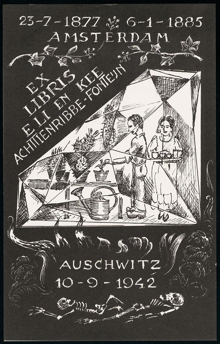 Ex libris (ter nagedachtenis aan) van wijlen Eli Achttienribbe en Kee Achttienribbe-Fonteijn, circa 1950