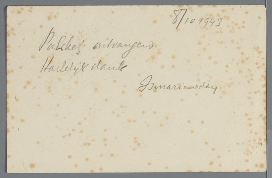 Briefkaart van familie Engelander in Amsterdam aan fam. Cees en Jenny Zom-Engelander in Amsterdam, oktober 1943