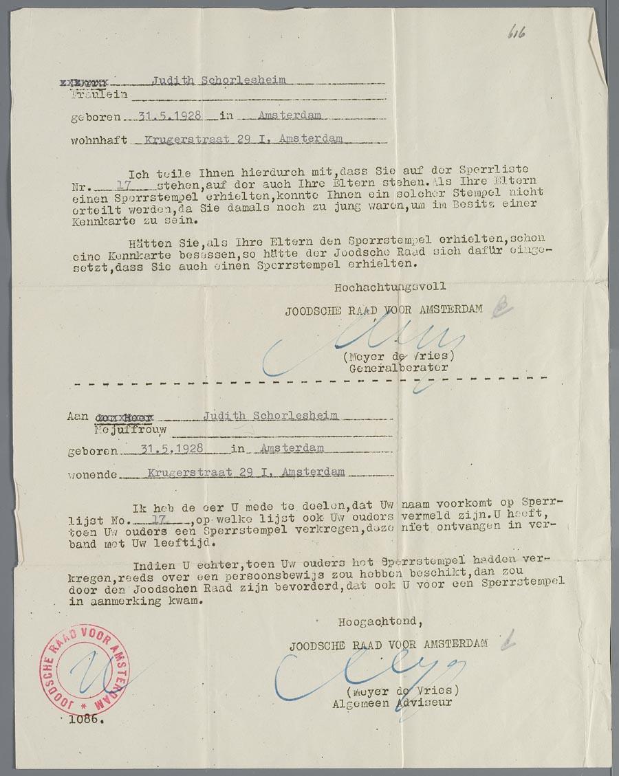 Mededeling van de Joodse Raad dat Judith Schorlesheim op Sperrlijst no. 17 voorkomt, circa 1942.