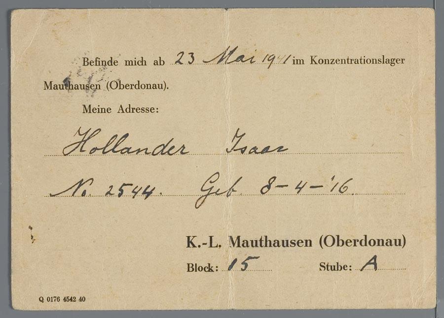 Briefkaart van Isaac Hollander aan zijn ouders in Amsterdam, met de mededeling dat hij zich vanaf 23 mei 1941 in kamp Mauthausen bevindt