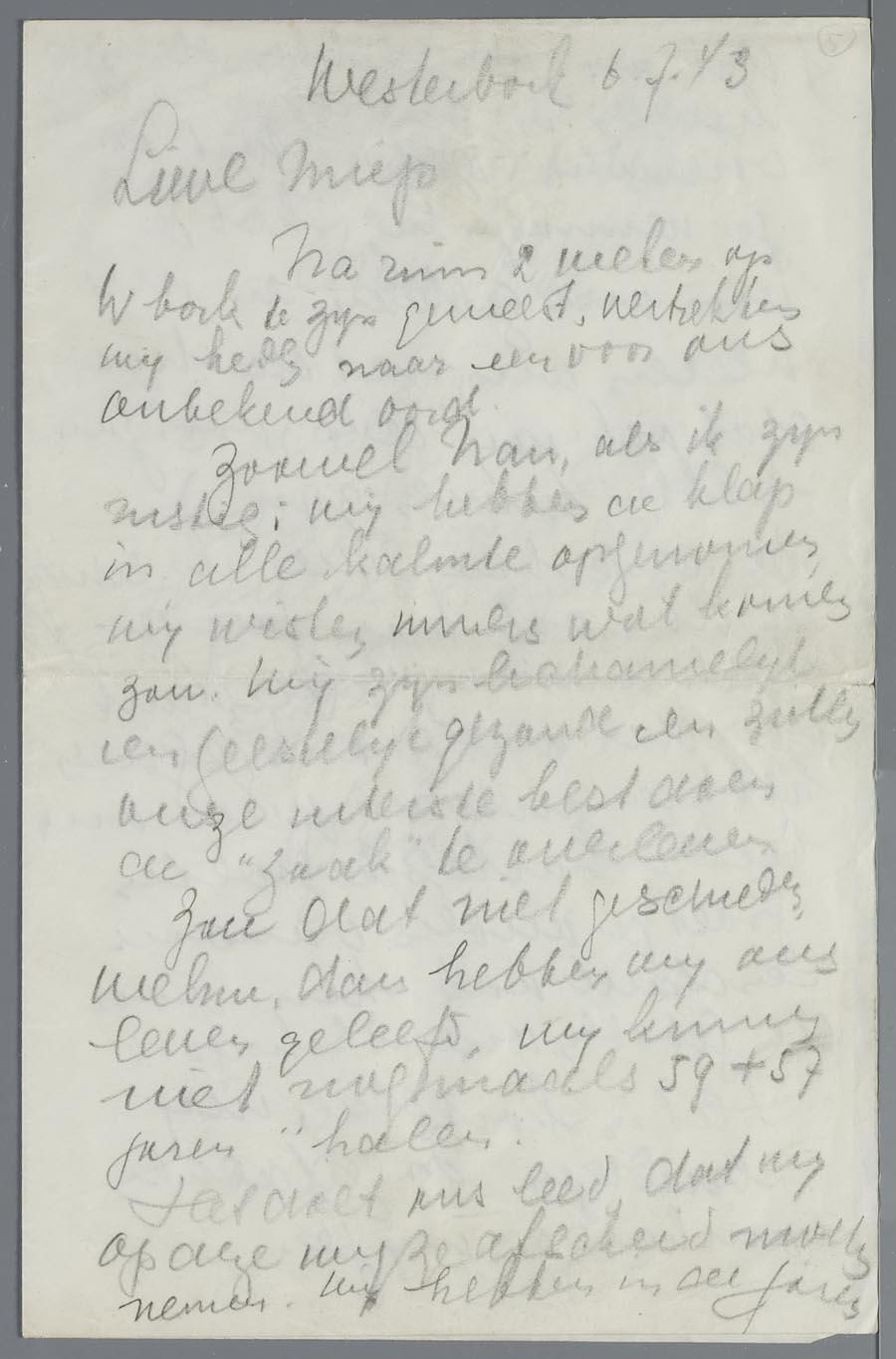 Afscheidsbrief van Alida en Nancy de Jong die vanuit Westerbork naar onbekende bestemming vertrekken, aan Marie Verschuur, juli 1943