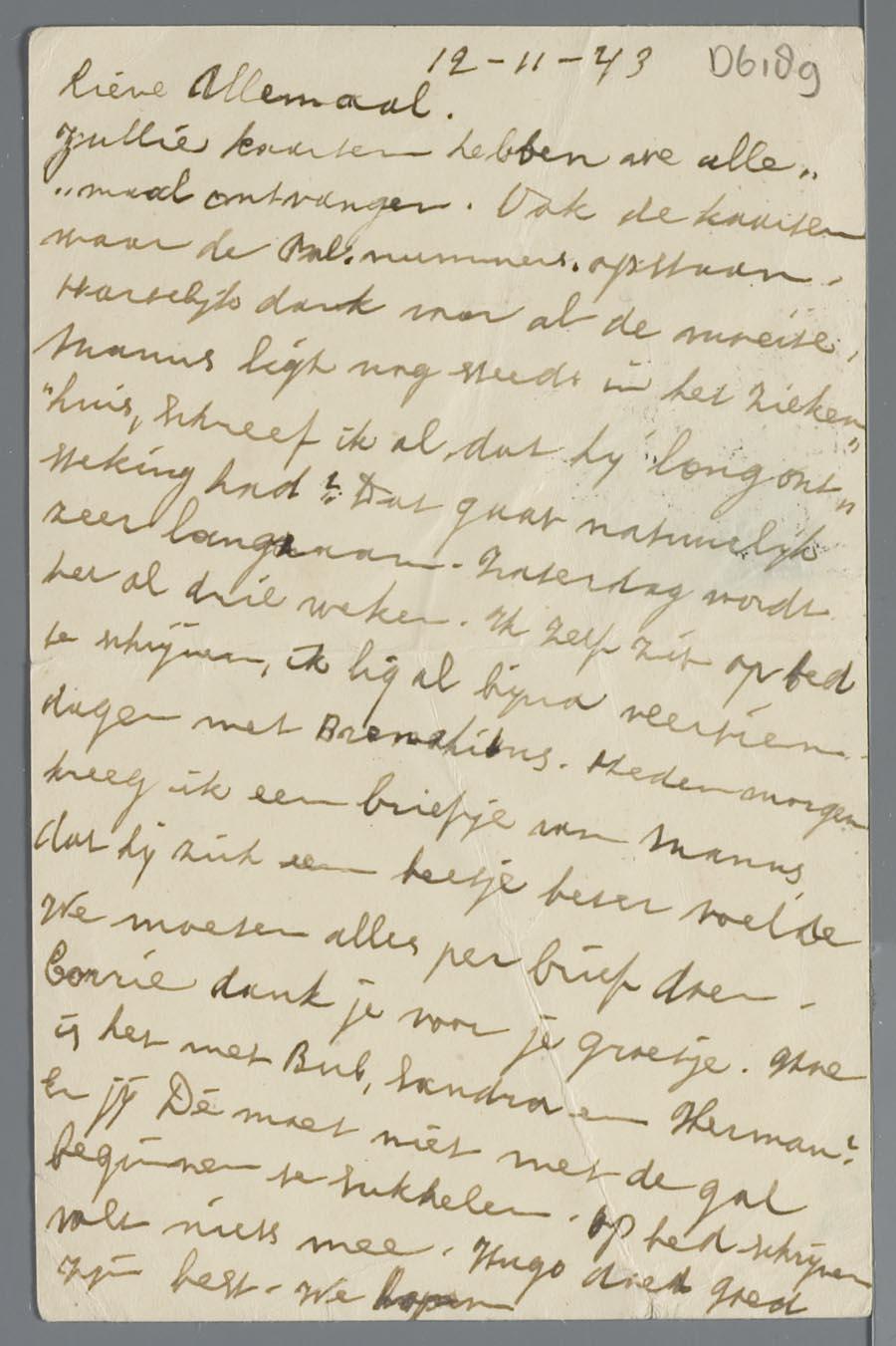 Cornelia Lindeman schrijft over de ziekte van haar man Herman Lindeman die in het ziekenhuis van Westerbork ligt, en over zojuist ontvangen papieren van de Joodse Raad met nummers van Palestinacertificarten: 'dus dat is ook in orde.'