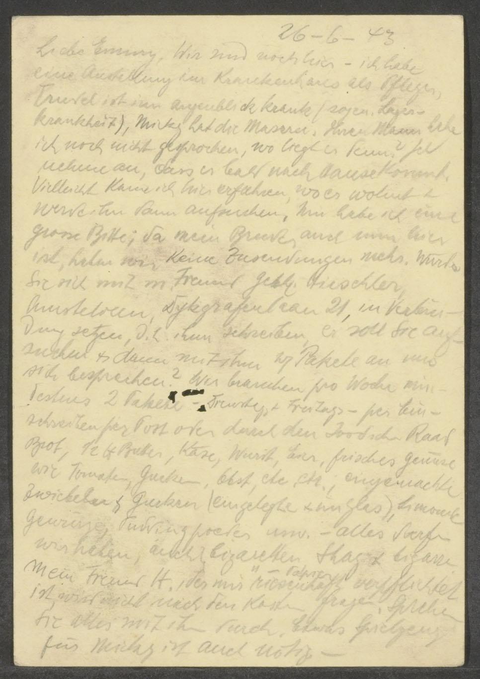 Oskar Jüdel vraagt Emmy contact op te nemen met een vriend van het echtpaar Jüdel in Amstelveen, om pakketten te sturen en om wat speelgoed voor zijn zoontje Micha (Michael Dan Jüdel, Amsterdam, 18 februari 1941- Sobibor, 23 juli 1943).