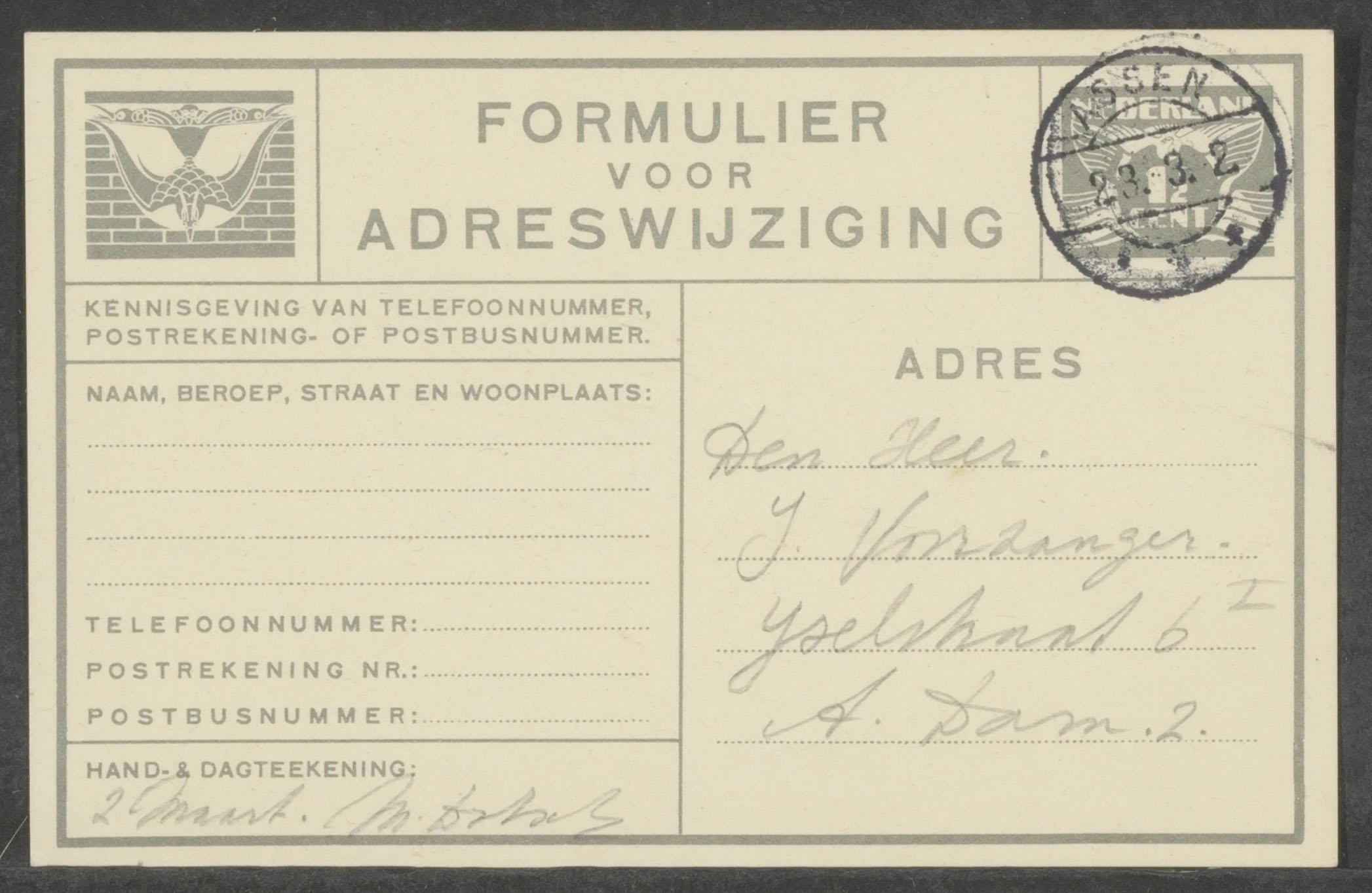 Adreswijziging van fam. Voorzanger vanuit Westerbork naar onbekend, 2 maart 1943