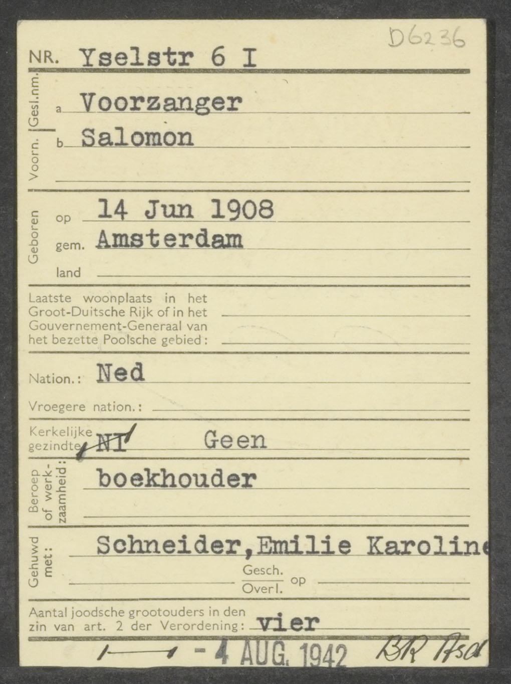 Aanmeldingsbewijs voor personen van geheel of gedeeltelijke joodschen bloede t.n.v. Salomon Voorzanger, 1941