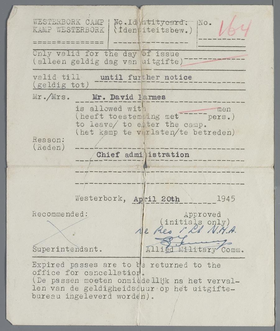 Bewijs voor David Barmes dat hij, als 'chief administration' kamp Westerbork mag verlaten, april 1945
