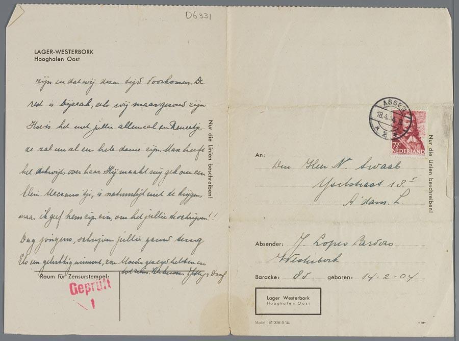 Vier brieven van Jetty Lopes Cardozo-Swaab in Westerbork, aan familie Isaac Swaab (Pretoriusplein) en familie Nico Swaab (IJsselstraat), 1944