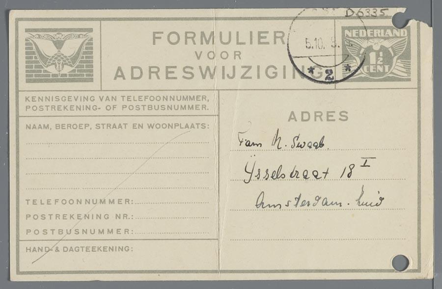 Adreswijziging van fam. Ossedrijver-Boutelje van de Rijnstraat in Amsterdam naar Westerbork, verstuurd aan fam. N. Swaab in de IJsselstraat in Amsterdam, september 1943